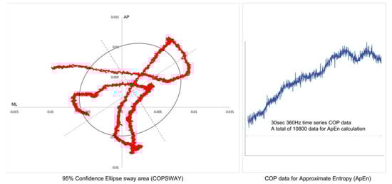 The 95% Confidence Ellipse sway (COPSWAY) and Approximate Entropy calculated by the center of pressure during the 30 s postural task.