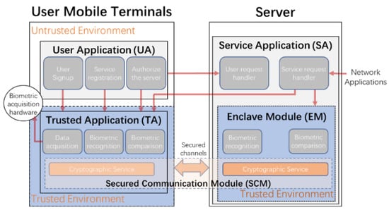 In local processing solutions, biometric data are processed and stored in local secured environments to ensure data privacy and service security. Currently, operating systems for both terminals and servers have become huge and complex because they must support multiple devices and rich applications. As a result, they have become more and more vulnerable, because system software vulnerabilities depend on code size and complexity []. Therefore, current CPUs offer a special execution environment isolated from the OS, such as ARM TrustZone [,,], and Intel SGX [,] and RISC-V Keystone []).