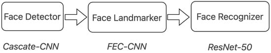 Facial Recognition and Comparison: Currently, many open-source projects for facial recognition are available from GitHub, and Table 4 lists some popular projects. In our implementation, we chose SeetaFace2 because it is built with C++, is independent of third-party libraries, and is compatible with X86, iOS, and Android systems. We used pretrained models from the SeetaFace2 project. According to the SeetaFace2 document, Cascaded-CNN is used as a face-detection algorithm, achieving 92% in the FDDB public dataset. FEC-CNN is used as a face landmaker algorithm, achieving a 0.069 average positioning error on the 300-W Challenge public dataset. ResNet50 is used for facial feature extraction/comparison with 25 million parameters, and the model has been pretrained with 33 million photos with an accuracy rate of more than 98% in the general 1:N scenario on a 1000-person dataset when the error acceptance rate is 1%. Figure 2 shows the flow chart of the processes.
