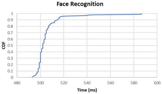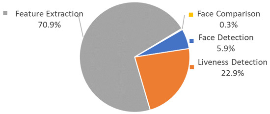 We measure the performance of the terminal TEE in conducting facial authentication upon different data inputs. The overhead of face recognition is 507.1 ms upon facial raw image input, while the overhead of face comparison reduces to 1.6 ms upon facial feature data input, as shown in Table 6. Figure 5 shows the cumulative distribution of time consumption in face recognition, and we can see that the performance of the terminal TEE is quite stable. We perform further research on each step of face recognition and find that feature extraction and liveness detection are the most time-consuming steps, accounting for 70.9% and 22.9%, respectively, as shown in Figure 6.