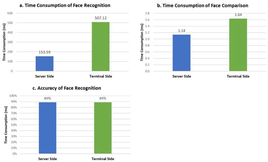 We measure the performance difference between the terminal TEE and the server enclave during facial authentication. To ensure the comparability of experimental results, we specify that the same algorithmic code runs in a single thread on a single CPU core in both environments. The evaluation results show that the face-recognition cost of the terminal TEE is more than three times that of the server enclave, the face-comparison overhead on both sides is as low as 1–2 ms, and the face-recognition accuracy is equal on both sides. Please refer to Figure 7 for more details.