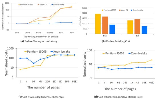 Generally, the performance overhead of server enclaves consists of three major parts: enclave memory access latency, enclave switching cost, and enclave dynamic-memory-management cost. Figure 8 lists the evaluation results of the three parts in professional tests []. Specifically, on the Intel Xeon Icelake platform, the overhead caused by enclave memory access latency is almost negligible, the enclave switching cost is less than 10,000 CPU lifecycles, and the enclave dynamic-memory-management cost is quite high. The performance analysis is instructive for further optimization of the current implementation.