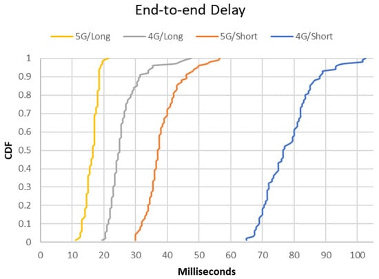 Most user terminals communicate with the server through short or long TCP/IP connections over a 4G/5G network, and we measure the end-to-end delays of different communication methods. Based on the experiment, the average delay is 39.7 ms for one-way trips between the terminal and the server, long TCP/IP connections have lower latency than short connections (average 21.1 ms vs. 58.3 ms), and 5G networks show better performance than 4G (average 27.3 ms vs. 52.1 ms). Figure 9 shows the experimental results in detail.