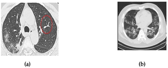 Sample CT scan images of 2 COVID-19 patients (a) COVID-19 infected (b) normal CT scan.
