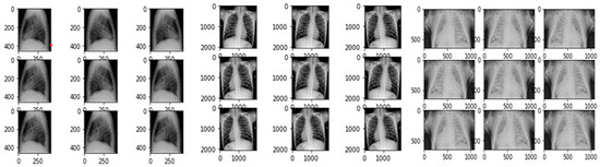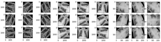 The acquirement of the data images from the aforementioned imagery datasets (Dataset 1 (formed on X-ray images), Dataset 2 (formed on X-ray images), and Dataset 3 (formed on CT scan images)) denotes the commencement of the framework proposed in this research work. Such images are passed on to the pre-processing module of the proposed framework that is standardized and allows for the integration of the data from the various datasets to carry out various pre-processing mechanisms for improving the accuracy and performance of our proposed architecture. As a part of image pre-processing, data augmentation was employed in order to improve the amount of data available during training and to incorporate diversity into the training data that helps to overcome the problem of overfitting. The data augmentation technique in this work consists of flip augmentation and rotation augmentation which increase the number of data samples. The state of images after performing augmentation and transformation is shown in the following figures (Figure 5 and Figure 6).