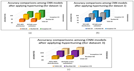 Comparison among VGG-19, ResNet-50, and Inception V3 in terms of accuracy for (a) dataset 1, (b) dataset 2, and (c) dataset 3.