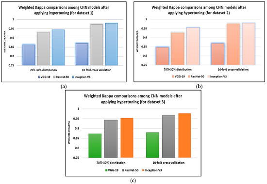 Comparison among VGG-19, ResNet-50, and Inception-V3 based on kappa statistic values for (a) dataset 1, (b) dataset 2, and (c) dataset 3.