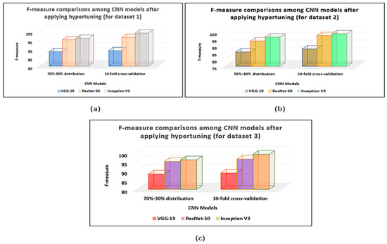 Comparison among VGG-19, ResNet-50, and Inception V3 in terms of F-measure for (a) dataset 1, (b) dataset 2, and (c) dataset 3.