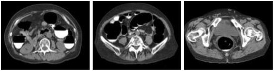 However, even with the images generated using the proposed method, barium was not removed in some cases where there was no air space in the intestinal tract and the colon was completely filled with barium. This may be due to the fact that few of the original CTC images used in the study were filled with barium. CTC is also used to identify extraintestinal lesions as they are included in the range of imaging from the upper to lower abdomen. The Extracolonic Findings Reporting and Data System was used to determine extraintestinal organs. It has been reported that tumor lesions in abdominal organs other than the colon and lesions, such as aortic aneurysms, can be detected [25,26]. Therefore, lesions and organs outside the intestinal tract must be depicted in CycleGAN-generated images without defects. As shown in Figure 9, the proposed method showed no degradation of the lesions outside of the intestinal tract, indicating that it can be used to diagnose these lesions.