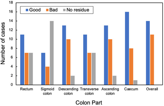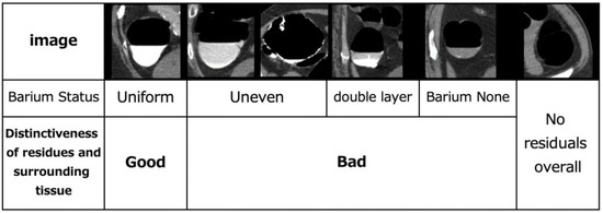 As the colon is a very long organ, the water content of residual fecal fluid differs between the rectum and cecum. Therefore, the condition of the pretreatment residuals also varies. The state of pretreatment barium greatly varies with each person depending on the state of the bowel of the patient [23]. The cleansing process depends on the barium status of the CT, and it is necessary to understand its current status. The condition of barium in the collected original CTC images can be classified into the following categories: homogeneous, uneven and heterogeneous, heterogeneous with a sticking to the intestinal wall, barium and residue separated into double layers, no barium in the residue, and no residue. The barium status of the original CTC images of the 25 cases was defined and evaluated, as shown in Figure 2. The assessment was conducted by a radiological technologist with 20 years of clinical experience and certified by X-ray CT technologists or radiological technologists. Figure 3 shows the distribution of barium in the rectum, sigmoid, descending, transverse and ascending colons, and cecum. The overall number of good cases was calculated by subtracting the number of bad cases from the number of good cases. The total number of good and bad cases was 14 and 11, respectively.