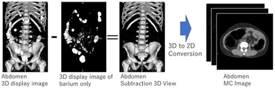 An overview of the creation of a manually cleaned image is shown in Figure 4. The first step was to manually extract only the barium in the collected original CTC images in 3D while displaying the 3D image of the barium area and confirming that calcification of blood vessels and stones were not selected. The 3D image obtained by subtracting the manually extracted barium area image from the original CTC image was converted to a two-dimensional axial image, which was used as an MC image for CycleGAN training. The VR function of Ziostation2 (Ziosoft, Tokyo, Japan) was used for manual selection of barium regions. MC images were created as training data for this method by performing the above process on the 100 cases collected. In this process, the MC images for training were not created for images with serious artifacts. Consequently, 11,161 original CTC images and 10,944 MC images were used in the training data.