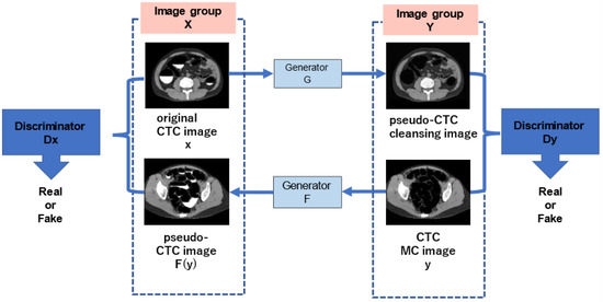 One problem with the cleansing process is that in cases of bad fecal tagging, the barium area is not correctly removed [13,14]. Bad fecal tagging signifies that the residue, residual liquid, and barium are nonuniformly mixed. In addition, a double layer phenomenon often occurs when only barium sinks, and unmixed intestinal fluid layer is formed on the surface. If the residue is badly tagged, the cleansing process becomes difficult and barium may remain in the same form as the lesion. In such cases, it may be difficult to distinguish barium from the lesion, and analysis and reading of the extracted lesion may take a long time. If the cleansing process is not available, it is necessary to disable this function for diagnosis, which complicates the reading of the lesion. To solve this problem, we focused on a domain transformation technique called a generative adversarial network (GAN) [15]. GANs were proposed by Goodfellow et al. in 2014 and are models that deepen learning by having two neural networks: one that generates images and another that determines whether the images are close to the real ones or compete with each other. By training features from the data, nonexistent data can be generated and transformed according to the features of the existing data. Various applications of GAN have been reported in the medical field [16,17,18]. Onishi et al. generated a large number of CT images of pulmonary nodules using GANs and used them as training data to discriminate between benign and malignant nodules [16]. Teramoto et al. generated high-resolution lung cell images using the progressive growth of GANs and improved the accuracy of differentiation between benign and malignant lung cancers [17]. Toda et al. generated CT images of lung nodules using Info GAN, which allows the control of image characteristics, and applied them to the histological classification of lung cancer [18]. In this study, we focused on CycleGAN [19], which is a derivative of GAN. CycleGAN is a method for realizing image transformation by learning the relationship between the fields or regions of two image data. CycleGAN can learn the relationship between two different images and obtain an image transformation algorithm without preparing a large number of paired images. Several applications of CycleGAN have been reported in the medical field. Hiasa et al. proposed a method to convert magnetic resonance head images into CT images and obtained good conversion results [20]. Zhou et al. proposed a method to remove noise from fluorodeoxyglucose positron emission tomography images and obtained good results in improving the positron emission tomography image quality at low doses [21]. However, no studies have been conducted to improve the above-mentioned problems of poor cleansing in clinical CTC examinations using CycleGAN [22]. If CycleGAN resolves the problems of double layer and uneven barium in CTC cleansing, the accuracy of CTC can be improved. Therefore, this study aimed to develop a cleansing process for CTC original images using CycleGAN, and its effectiveness was confirmed using actual clinical images.