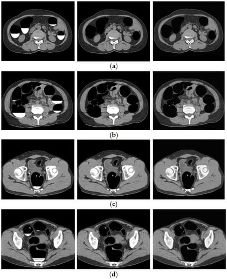 Generated image using the proposed method. (Left: original image, Middle: MC image, and Right: cleansed image using the proposed method.) (a) Ascending colon; (b) descending colon; (c) rectal colon; and (d) bad fecal tagging.