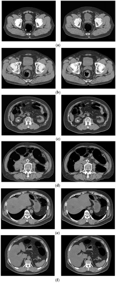 Cleansing image of the proposed method of the lesion. (Left: MC image and Right: cleansed image using the proposed method.) (a) Rectal polyp; (b) early rectal cancer; (c) kidney stone; (d) petrification of aorta; (e) mass lesion of the liver; and (f) fatty liver.