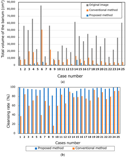 The total volume of barium in the 25 cases is shown in Figure 10a. The average volumes of the barium in the original, conventional, and proposed methods were 36,428.08 cm3, 9649.76 cm3, and 1359.88 cm3, respectively. Figure 10b shows the CRs. The average CRs of the conventional and proposed methods were 72.3% and 96.3%, respectively. Figure 11a,b show the barium CRs calculated for 14 and 11 cases of good and bad pretreatments, respectively. In the group of cases with good pretreatment, the barium CRs of the conventional and proposed methods were 79.0% and 96.4%, respectively. In the group of patients with poor pretreatment, the average barium CRs using the conventional and proposed methods were 63.8% and 96.1%, respectively.