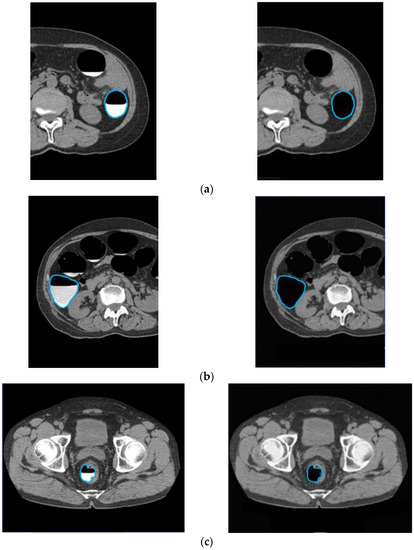 To confirm that an excess area was not removed when the barium was removed, an outline of the intestinal tract wall surface was drawn and overlapped with the original CTC image and the CycleGAN-generated image, as shown in Figure 12. In cases with good barium pretreatment (Figure 12a), poor pretreatment (Figure 12b), and lesions (Figure 12c), the intestinal wall, and lesions were not removed, and only barium was selectively removed, indicating that this technique correctly recognized and removed barium.
