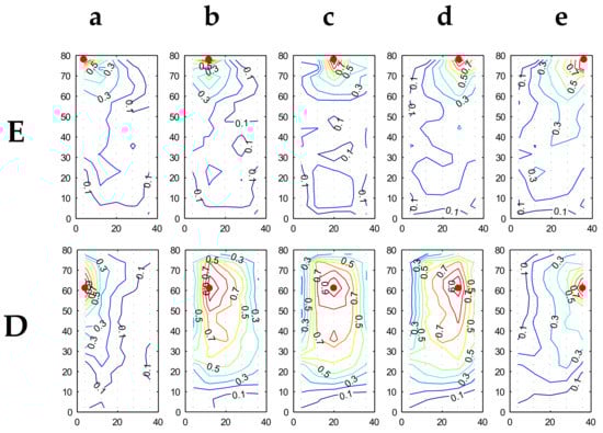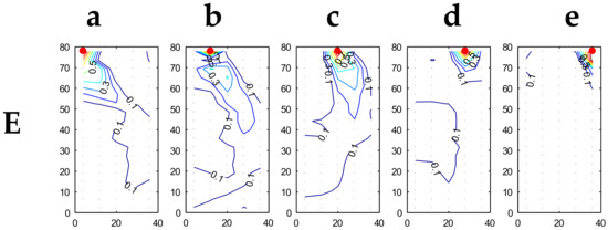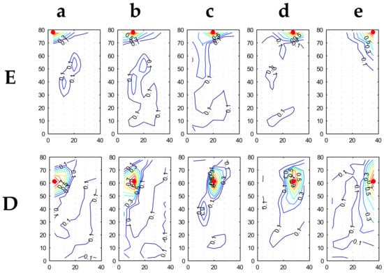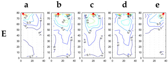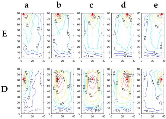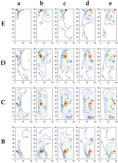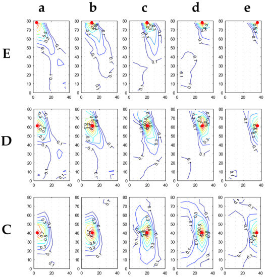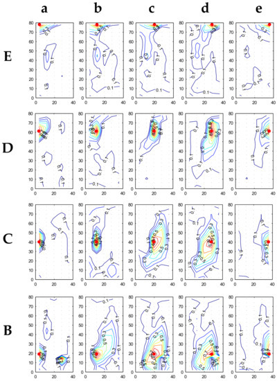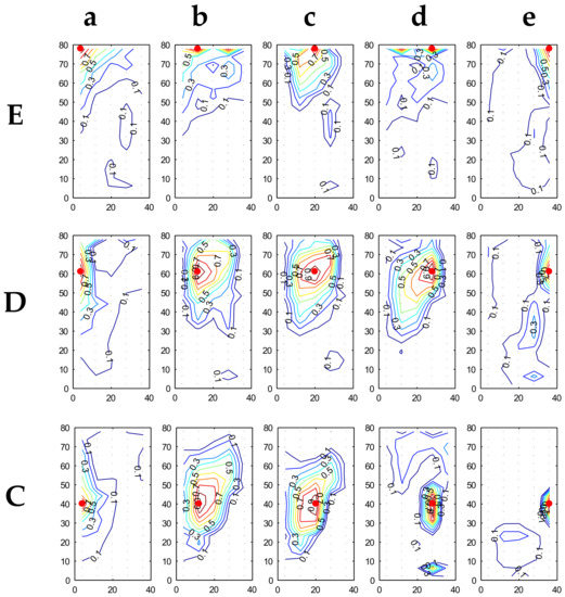The following subsections describe the characteristics of the correlation functions for the models described in Section 2, as reported in Figure 5, Figure 6, Figure 7, Figure 8, Figure 9, Figure 10, Figure 11, Figure 12, Figure 13, Figure 14, Figure 15 and Figure 16, for three selected wind directions: 0°, 45°, 90°. Each figure contains 25 pictures, quoted in the paper by a couple of letters corresponding to the row and the column where the picture is included, each one describing the correlation field between the reference point P0 (Equations (2) and (3)) denoted by a red point and the other points of the roof.