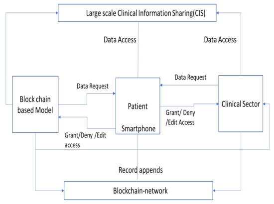 Clinical information sharing (CIS) among medical service providers is critical for the timely treatment of patients in transit and transfer. In general, patients should be able to manage access control to their health-related data. In current practice, patients sign a paper-based or digital agreement document detailing the health-data-sharing management plans. Electronic health records (EHR) require confidentiality, integrity, and availability (CIA), and blockchain technology can be useful to protect sensitive EHR. Blockchain technology secures data using a sequence of encryption and hashing, and blockchain is considered immutable by current technology standards. Blockchain technology is a decentralized security model that can tolerate partial system failures—a useful feat for EHR. The main benefit of blockchain technology is that every transaction is dynamic and does not depend on the amount of data. Figure 1 presents a flow diagram of blockchain technology usage in a large-scale CIS.