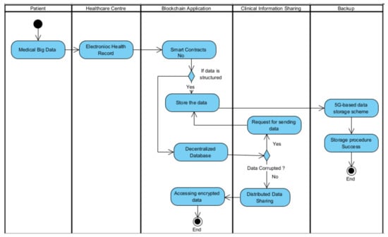 If any page includes new information, according to [25], it is not necessary to retrain until the consensus model is identified; if the error is less than, the new data do not provide ample information for the model; so, no update or conversion is needed. The same method can also be applied to other methods. Another scenario occurs when a platform leaves a private blockchain [26,27]. However, we can also neglect when the site exits while changing the model. This is because certain code transitions are just conceptual; the database architecture does not change until the node finishes the software update. Improvements in the model can be continued. The core algorithm for determining the learning order replaces the learning process before the consensus model is established. In Algorithm one, the CM model is applied and the second phase initializes the correct information. Select the all-new user for operation (create the new blockchain network) while the consensus learning method in the algorithm occasionally pauses before the consensus model is checked, continues, and never ends. Smart assets and contracts can be deployed automatically on every private network website. The entire transaction-based process occurs when a patient is admitted or visits a hospital, and the data are generated in diagnostic reports known as electronic health records (EHR). Blockchain technology is implemented and a smart contract is placed based on data availability from an authorized healthcare center; this also applies if the data are structured and stored through a 5G network-based [28] data storage scheme. Furthermore, in Figure 5, the data are transferred to a highly secure decentralized database, which converts the data into encrypted data that can be shared among different healthcare centers.