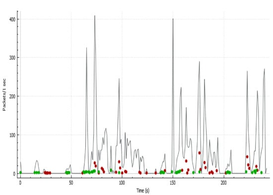 Data allocation time, waiting time, and total error rate are important factors in synchronous data storage and encrypted file-sharing systems in various healthcare centers. Figure 5 shows the time-series analysis of the number of packets sent over 5G-based encrypted data. The y -axis shows the number of packets transported over the 5G-based storage scheme, and the x-axis represents the time period for the entire data transfer process. In Figure 5, the green and red colored data points show the cluster points for simultaneous data back-up and encrypted data transfer for decentralized databases in clinical information sharing (CIS), respectively.