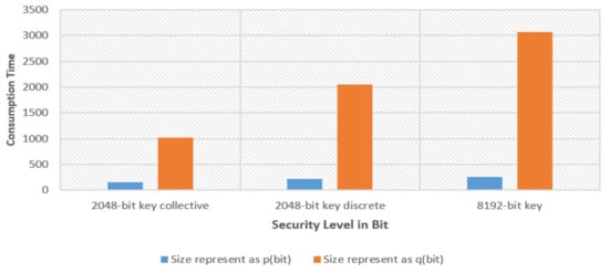 Public-key cryptography was used for pairing. In this study, an extra singular E(Fq) curve was used in order p above Fq, where p and q have two main numbers. Three variants (2048-bit key collective, 2048-bit key discrete, and 8192-bit key) of the advanced encryption standard (AES), RSA, and transport layer security (TLS) security key sizes were also checked. The representations of p and q in Table 6 show their respective values. Three protection parameters (k, l, l1, and 2048-bit key collective) were defined as the 2048-bit key discrete and 8192-bit key. Table 7 outlines the theoretical results of the computational cost. The results show that there were very few differences in the computational costs of the CIS services. As the security standard increases, the cost of the equipment increases gradually.