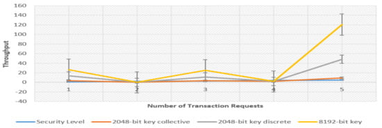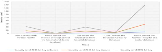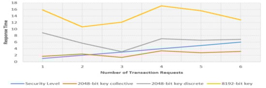 The specific field in which the current method was implemented involved the following: We used the system configuration for the simulation of 16 GB RAM with an i5 core processor @2.30GHz and Ubuntu 20.04 operating system. Python was used for cryptographic technique implementation, and simulations were performed using the PyNaCl, cryptography, and pyOpenSSL libraries. We applied 30 blockchain nodes to perform the communications. Each node was mounted on a simulation machine based on [29] and run on an independent port from the host. On an Ubuntu 20.04 computer, we developed 30 identical Ubuntu 20.04 computer labs to deploy the other 29 blockchain nodes. This computer was designed based on [30] with 16 GB RAM, an i5 core processor @2.30GHz, and Ubuntu 20.04 operating system. We designed the laboratory setup using the 16 GB RAM and Ubuntu 20.04 operating system. All systems were connected using the LAN network. The computation time for the proposed framework with dissimilar security levels are presented in Figure 6.