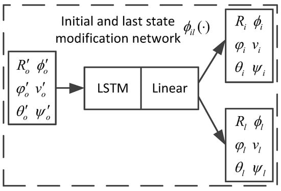 When trajectory prediction is achieved by the integral-iteration method, the initial state of integration has a great influence on the prediction precision. As can been seen from Figure 1, The original data and observation data are brought into the initial and last state modification network, which is designed to modify the initial and last state of observation data, in order to generate a more accurate initial and last state. The LSTM network with a size of , and the fully connected network with a size of are used for training. The observed normalized 6-dimensional state sequence is brought into the LSTM network with 128 hidden nodes at 2 layers to learn temporal relationship, and then it is integrated into the fully connected network for dimensionality reduction, which is used to obtain the state of modified initial and last state, and , respectively. The structure is shown in Figure 2.