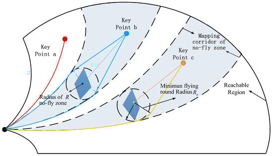 As shown in the Figure 4, analyzing the key points within the reach region, the relationship between the position of the target, no-fly zones and key points should be discussed. It is assumed that the radius of no-fly zones is . The mapping area of no-fly zone is named no-fly zone mapping corridor, which is between the trajectories generated with a constant bank angle and tangent to the no-fly zone circle. If the key point is within the mapping corridor and sheltered by the no-fly zone, the bank angle needs to be adjusted to avoid the no-fly zone. Otherwise, the trajectory can join the target and key point directly keeping the constant bank angle, such as key point a. For the key points located in the mapping corridor, such as key points b and c, it is necessary to obtain the trajectory and position tangent to the no-fly zone circle. It is generally thought that the less maneuvering operations the target performs, the more energy it can save, so the tangent trajectories can be seen as the approximate trajectory. If the lift of the target is sufficient, based on the Dubbins circle, the turning circle radius of the target is , and the acceleration of tuning satisfies