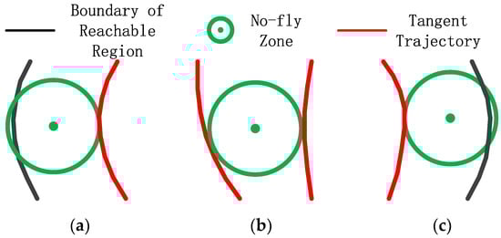 The relationship between the no-fly zone and the reachable region can be divided into full inclusion and partial inclusion. When one boundary of the no-fly zone is out of the reachable zone, as shown in Figure 6a,c, the tangent point on one side should be discussed. When the no-fly zone and the reachable zone are shown in Figure 6b, the positions of tangential points on both sides of the no-fly zone need to be determined. The corridor condition can be expressed as