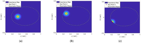 The extreme points of mixing probability are considered the key points attacked by the target. The distribution of probability density can be shown through the heat map, which means the absolute importance of each position and is named as importance map. Compared with the representation by simple points, the importance map can describe the importance of strategic places in more detail and rationality. What is more, based on the proposed model, the comprehensive influence of all strategic places on each position can be obtained that may generate a new key point. As shown in the following three examples, the importance distributions of the strategic places calculated by the importance map are shown in Figure 3.