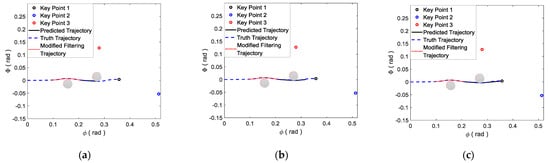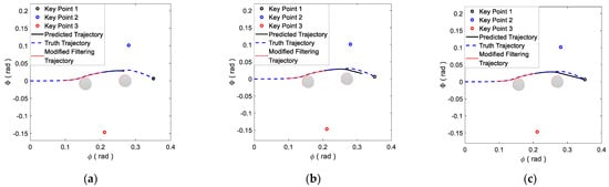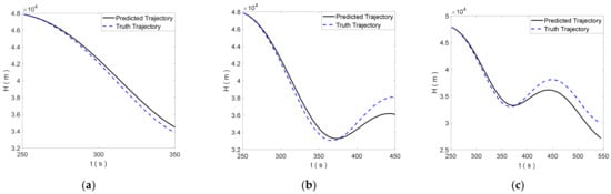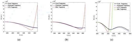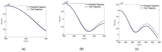 The above two prediction methods for comparison rely on parameter fitting; when the extrapolation time by integration is longer than 100 s, the prediction errors of the two methods begin to diverge rapidly, and the divergence effect is shown in Figure 21 and Figure 22. As can be seen from Figure 21a,b due to the imprecise prediction for nonlinear changes of control parameters with the pure fitting of parameters, the prediction error diverges rapidly, especially in the longitudinal direction. For the lateral direction prediction, since pure parameter fitting cannot change the sign of bank angle, the direction of the target’s velocity and the direction of the key point may be reversed, as shown in Figure 22a,c. From long-term trajectory prediction, as shown in Figure 21c and Figure 22c, the proposed method obtains longitudinal prediction results within 300 s without the divergence of error. On the other hand, for the lateral prediction, because of a correct intention inference and sign variation rule of bank angle logic, the lateral long-term trajectory prediction can still maintain high precision. The specific prediction results for 100 s, 150 s and 200 s are shown in Table 2. Here, the reference method is the prediction method in the literature [18].