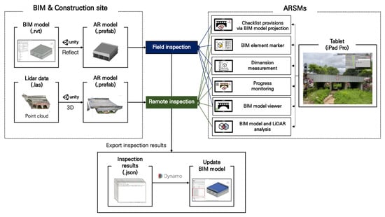Figure 1 provides an overview of AROS. AROS has been developed to be deployed to handle the needs of safety and quality inspections for infrastructure projects. AROS allows inspections to be performed directly in the field, as well as remotely from the site office. For “field inspection,” AROS provides a series of functions and user interfaces customized for direct use by site inspectors. “Remote inspection” provides a set of functions for off-site management that enables continuous inspections despite restrictions, such as weather or site inaccessibility. Specifically, point clouds acquired through laser scans and virtual models are projected side-by-side, allowing inspections between as-built and as-planned models.