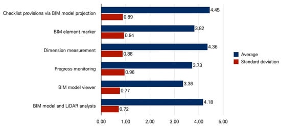 The functions ‘Checklist provisions via BIM model projection’, ‘dimension measurement,’ and ‘BIM model and LiDAR analysis’ ranked highest, with mean values over 4.0; the functions with the highest utility. The results revealed that the experts deemed these functions to have the highest utility in common and periodic inspection tasks. The lowest score was recorded in the ‘BIM model viewer,’ with a mean value of 3.36. Therefore, separately displaying a BIM model is useful, but not on a frequent basis. The differences in the standard deviations were not large (i.e., 0.72–0.96), confirming that the results represented a consensus between the experts as to the utility of the individual AR functions.