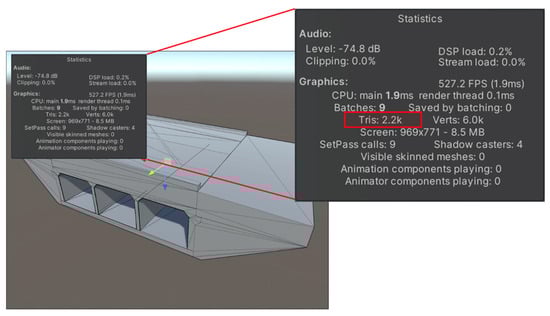 Based on investigations into the specifications of iPad Pro and Unity 3D, the recommended range for optimal rendering performance in terms of mesh numbers was between 300 and 1500 (Unity3D (version 2020.3) recommends this range, assuming that the latest high-end hardware is used in mobile devices (https://docs.unity3d.com/560/Documentation/Manual/ModelingOptimizedCharacters.html (accessed on 17 October 2022))). The two most representative high-end mobile devices are Apple’s iPad Pro (4th generation, A12Z Bionic chip with 64-bit architecture, 6 GB RAM) and Samsung’s Galaxy S8 Ultra (Qualcomm Snapdragon Gen 1 SM8450, 16 GB RAM). As a result of comparing the two devices, the rendering performance of the iPad Pro was superior, and LiDAR was also embedded, so this study utilized an iPad Pro as AR implementation hardware). However, the number of triangle meshes for the bridge model included over 2200 meshes (red box in Figure 6) and exceeded these specifications. This was identified as a primary cause for deterioration in projection stability.