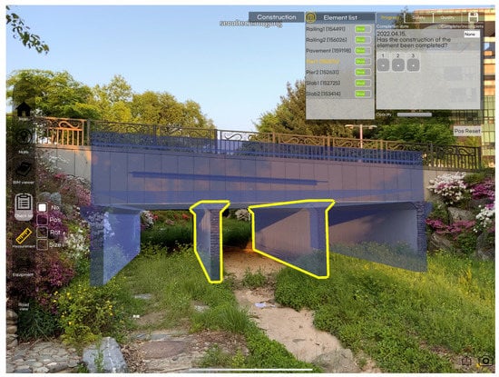 Table 3 shows the main functions of AROS and their examples. These functions were developed based on surveys and interviews with site management experts [] and included (1) checklist provisions via BIM model projection, (2) BIM element marker, (3) dimension measurement, (4) progress monitoring, (5) BIM model viewer, and (6) BIM model and LiDAR analysis. The last function was developed exclusively for off-site inspections, whereas the other functions can be used for both field and remote inspections.