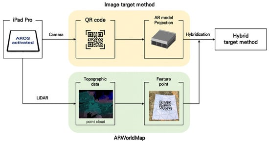 This study used a session state world-tracking approach to supplement the ‘Image Target’ method of AROS_α. Specifically, the ARKit platform provides ‘ARWorldMap,’ a technique that uses the details of the user’s physical space to determine the device’s position and orientation, as well as any anchor objects added to the session that can represent detected real-world features or virtual content. ARWorldMap first identifies the physical features around the user, after which the information is used to anchor the AR model to an identical location in the same direction (https://developer.apple.com/documentation/arkit/arworldmap (accessed on 5 May 2022)). The physical features and topographical objects are obtained from point clouds collected from the LiDAR attached to the iPad device. In effect, these are used to create multiple anchor points. Moreover, ARWorldMap stores spatial measurement data on the device, so the anchors can be used for quick re-projections in the same location.