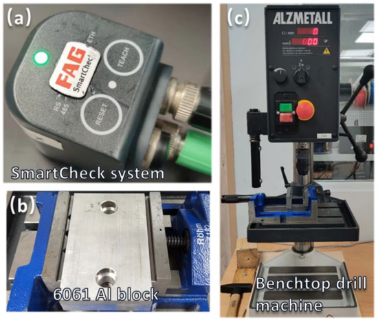 (a) An image of the SmartCheck system, (b) an image of the aluminum block, and (c) an image of the drill machine used in the experiment.