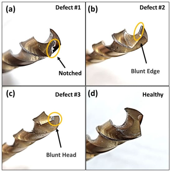 Figure 3 presents three drill bits with three artificially created defects and a drill bit without defects. Yellow circles show the defect positions. Figure 3a presents a notched blade edge. There is evident damage on the edge of the blade. Figure 3b presents a blunt edge in a drill bit, as shown in the yellow circle. The edge of the drill bit was polished by file tools, which made the blade not as sharp as a healthy drill bit. Figure 3c presents a defective drill bit with a blunt head. The top of the drill bit was flattened. A yellow circle highlights this in the image. These are the most common defects in drill bits caused by daily operations [23]. Lastly, Figure 3d presents a healthy drill bit without defects.