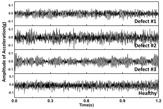 Figure 4 presents the time-domain vibration signals of the four drill bits with different health conditions. Defects #1, #2, and #3 represent the “notched” drill bit, the drill bit with a “blunt edge”, and the drill bit with a “blunt head”, respectively. “Healthy” represents the drill bit with no damage. The figure shows the accelerometer read-out. The amplitude corresponds to the unit in g (1 g = 9.81 m/s2). A larger amplitude represents a larger vibration amplitude. Each data set contains 32,770 data points. From the figure, it can be observed that the vibration signals contain a large amount of noise. It is challenging to distinguish the differences between each condition. In particular, the signal amplitude and vibration features of defect #1 and the “healthy” sample are very similar. Therefore, further data processing is needed for defect diagnosis. Although some researchers use raw vibration data to perform 1D CNN for bearing fault detection [16], it requires a large amount of computation. This study applied a short-time Fourier transform to reduce the data size and the noise effect.