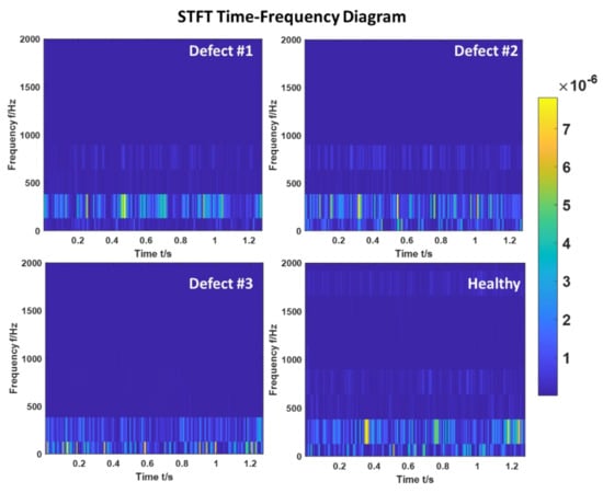 Short-time Fourier transform (STFT) was selected as the feature extraction method in this experiment. STFT applies Fourier transform for localization in both the frequency and time domains of time-varying signals [24]. Because of the advantages of frequency-domain analysis of nonstationary signals, STFT is considered a promising approach for analyzing vibration signals under complex conditions or with background noises [15].