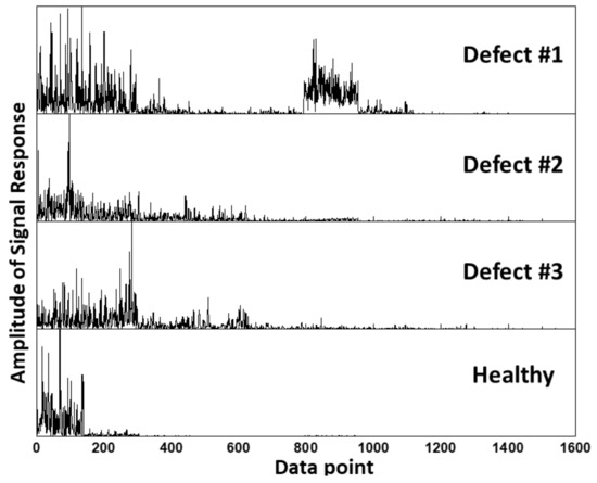 After analyzing the vibration signals, it was found that most of the vibration signals were observed in a frequency range lower than 1300 Hz. Therefore, only a frequency range lower than 1300 Hz was kept during the data reconstruction process. A 1 × 1536 matrix was created to represent each measurement. The data size was reduced significantly. It led to a reduction in calculation complexity and increased the processing speed. Figure 6 shows the reconstructed data set for different health conditions. The y-axis shows the corresponding signal response to each data point in the data set. The figure presents an obvious difference in the signal response of the different drill bits. For example, in defect #1, there are obvious peaks in the range of the data points from 800 to 1000. On the other hand, the figure shows that most of the peaks are constructed in the first 200 data points for the healthy drill bit. Defects #2 and #3 show high similarities to each other. The reconstructed data sets were used as the input data in the 1D CNN process for further analysis.