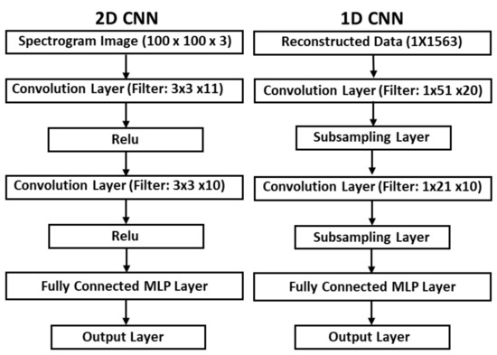 In this experiment, two CNN structures were established for defect detection and classification. The structures of both CNN processes are presented in Figure 7. For the 2D CNN, the input data were a set of labeled spectrogram images. The size of the input image was 100 × 100 pixels. The first convolution layer contained 11 filters with a size of 3 × 3. The second convolution layer contained 10 filters with a size of 3 × 3. After the convolution layers, a fully connected layer was added. For the 2D CNN, 70% of the labeled data were used to train the network, and 30% of the data were used as the testing samples.