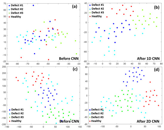 Figure 9 shows the t-SNE results for the test data set before and after applying the 1D convolution and 2D convolution process receptivity. Figure 9a,c present the original data set. Figure 9b,d show the features obtained after the convolutional layers. Compared to the original data set, it clearly shows that all the data points have been gradually separated. In Figure 9b,d, the “healthy” samples are separated from the others clearly. Some overlapping or mixed data points can be observed between defect #1 and defect #2. The results match the classification results shown on the confusion matrix, where the “healthy” sample has 100% accuracy, and there are some classification errors in defect #2 and defect #3.