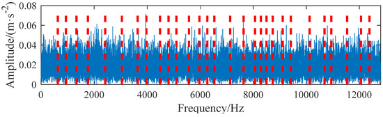 The envelope spectrum of the simulated signal with noise is shown in Figure 4. The frequency component of the signal is very complex, and the fault characteristic frequency is submerged in the noise, making it difficult to distinguish. FFT is performed on the simulation signal to obtain the Fourier spectrum, and then EWT is performed based on the scale space method to obtain the spectrum segmentation, as shown in Figure 5. After decomposition, 30 empirical mode components are obtained in total, and their corresponding kurtosis values of the square envelope spectrum and cross-correlation coefficients with the original signal are calculated, respectively. Here, the KSES value is normalized for comparative analysis with the CN value, and the results are shown in Figure 6.
