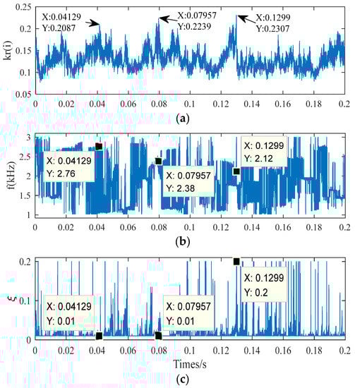 To save calculation time and improve efficiency, the parameter range of correlation filtering is set here according to the decomposition result of EWT. The base atom also uses the Laplace wavelet, as does the subsequent verification. Its parameters are set as resonance frequency , damping ratio , , and support interval . The result of the correlation filtering is shown in Figure 7. Looking at the correlation coefficient between the simulated signal of the fault and the base atom, the higher peak point does not appear periodically, and it is not easy to judge whether it is the peak point corresponding to the fault shock signal. In this paper, the resonance frequency and damping ratio of three peak points with a higher value are used to study this further. It can be seen that the resonance frequency f values of the three points are quite different, it is not easy to select the optimal value, and the optimal value deviates greatly from the set 2000 Hz. At the same time, the damping ratio tends to a lower value, which is inconsistent with the preset value. It shows that for a low signal-to-noise ratio signal, it cannot identify the correct damping ratio.