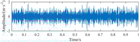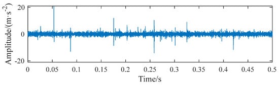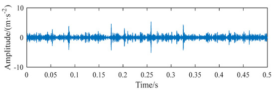 The parameters of the outer ring fault simulation signal yo(t) are set as: amplitude Ao = 2, sampling frequency fs = 25,600 Hz, outer ring fault resonance frequency = 2000 Hz, attenuation coefficient 1000, fault characteristic frequency fp = 54 Hz. The SNR of the added white Gaussian noise was −17 dB. The simulation fault signal with noise is shown in Figure 3.