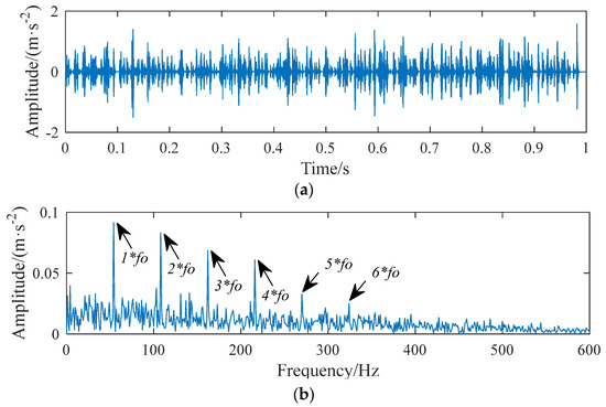 The overcomplete dictionary D is constructed according to the determined parameters and is substituted into the FSS algorithm together with the fifth component signal to solve the sparse coefficient and reconstruct the signal. The SNR is greatly improved by observing the reconstructed waveform, as shown in Figure 9a. At the same time, from Figure 9b, the fault characteristic frequency and frequency doubling can be readily found. The fault characteristic frequency of 54 Hz obtained from the observation diagram is consistent with that of the fault characteristic frequency of 54 Hz set by simulation.
