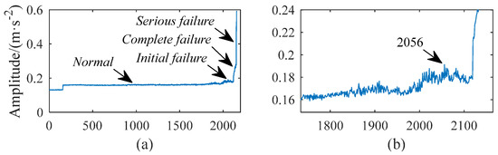 RMS value trend graph and partially enlarged graph of bearing 3 full life data: (a) RMS value trend graph; and (b) Partially enlarged graph.