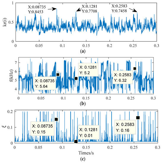 Correlation filtering result of original signal: (a) The correlation coefficient between the base atom and the original signal; (b) Resonance frequency of each point in ; and (c) Damping ratio of each point in .