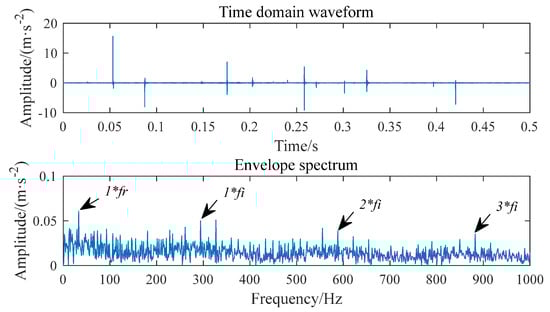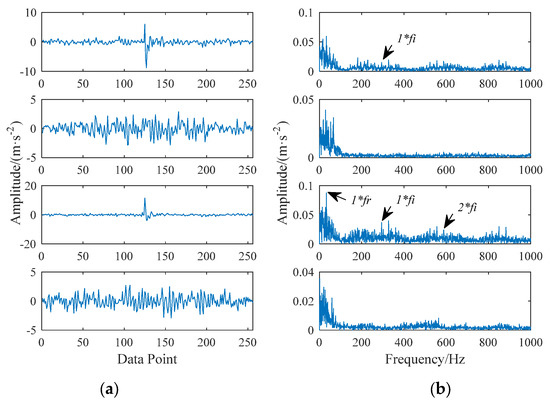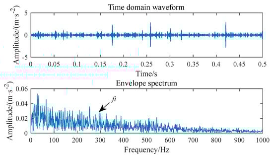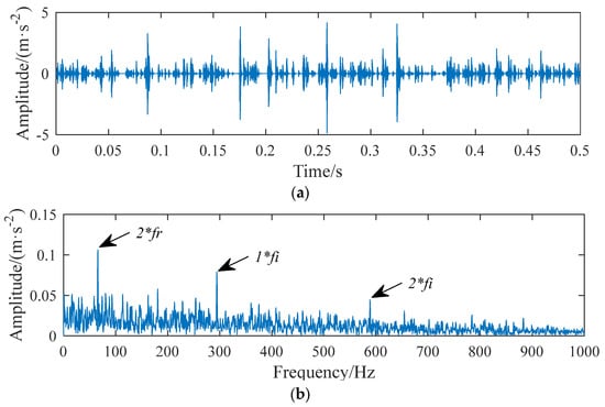 The waveform of the 10th component is shown in Figure 18. It can be seen that the SNR is still not high enough. The peak frequency 5134 Hz of the component frequency band is taken as the value of parameter f, the damping ratio , the support interval M = 68, and the time shift . However, once the LWDFSS-AEWT algorithm is used to solve the coefficient and reconstruct the signal of the 10th component signal, as Figure 19a,b show, the noise is largely removed. The fault characteristic frequency extracted, 294 Hz, is close to the theoretical fault characteristic frequency of the inner ring, which is 296.63 Hz, so it can be judged that the bearing inner ring is faulty.